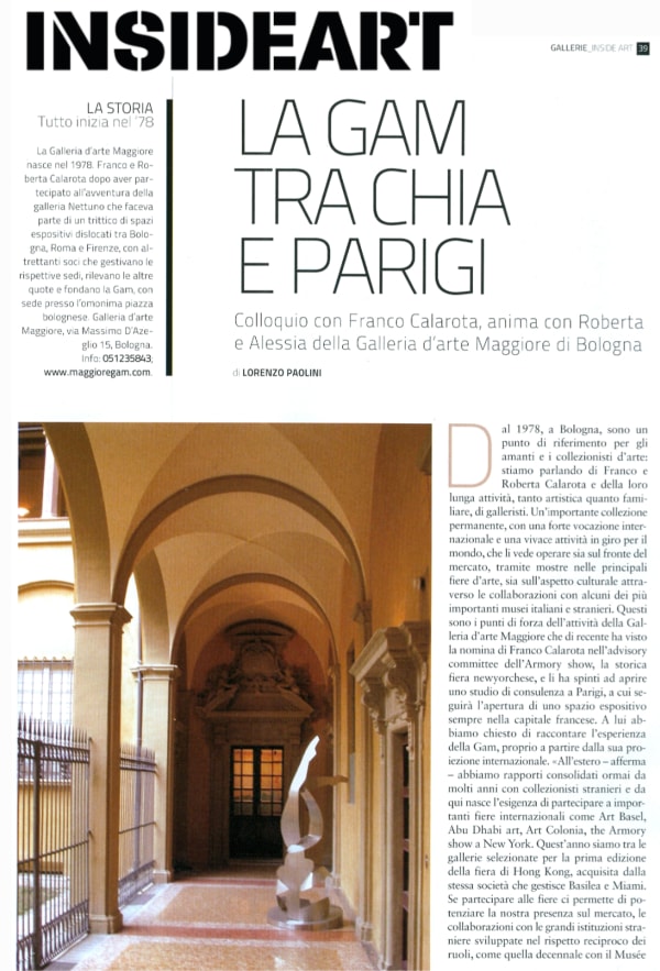 Franco et Roberta Calarota, directeurs de la Galleria d’Arte Maggiore, ont fait de leur espace d’exposition un point de référence solide et reconnu.AD - Architectural Digest , Janvier 30, 2003 -